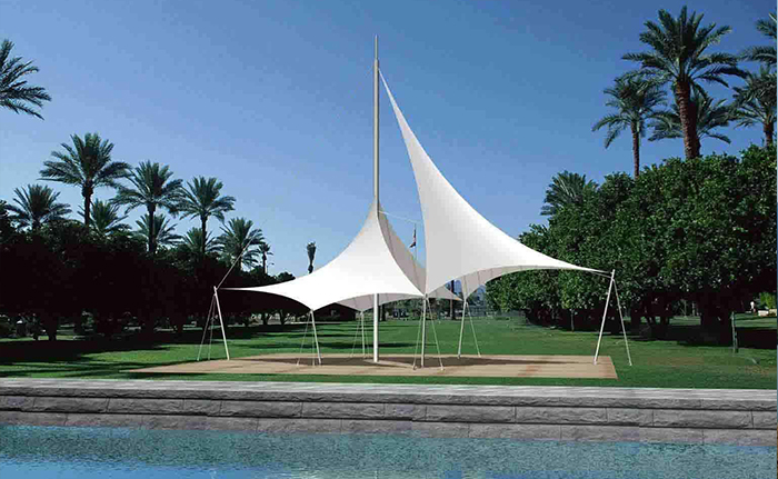 以膜材、鋼索及支柱構(gòu)成,利用鋼索與支柱在膜材中導(dǎo)入張力以達(dá)到安定的形式。除了可實踐具創(chuàng)意,創(chuàng)新且美觀的造型外,也是能展現(xiàn)膜結(jié)構(gòu)精神的構(gòu)造形式.近年來,大型跨距空間也多采用以鋼索與壓縮材料構(gòu)成鋼索網(wǎng)來支撐上部膜材的形式。因施工精度要求高,結(jié)構(gòu)性能強(qiáng),且具豐富的表現(xiàn)力,所以造價略高于骨架式膜結(jié)構(gòu)。